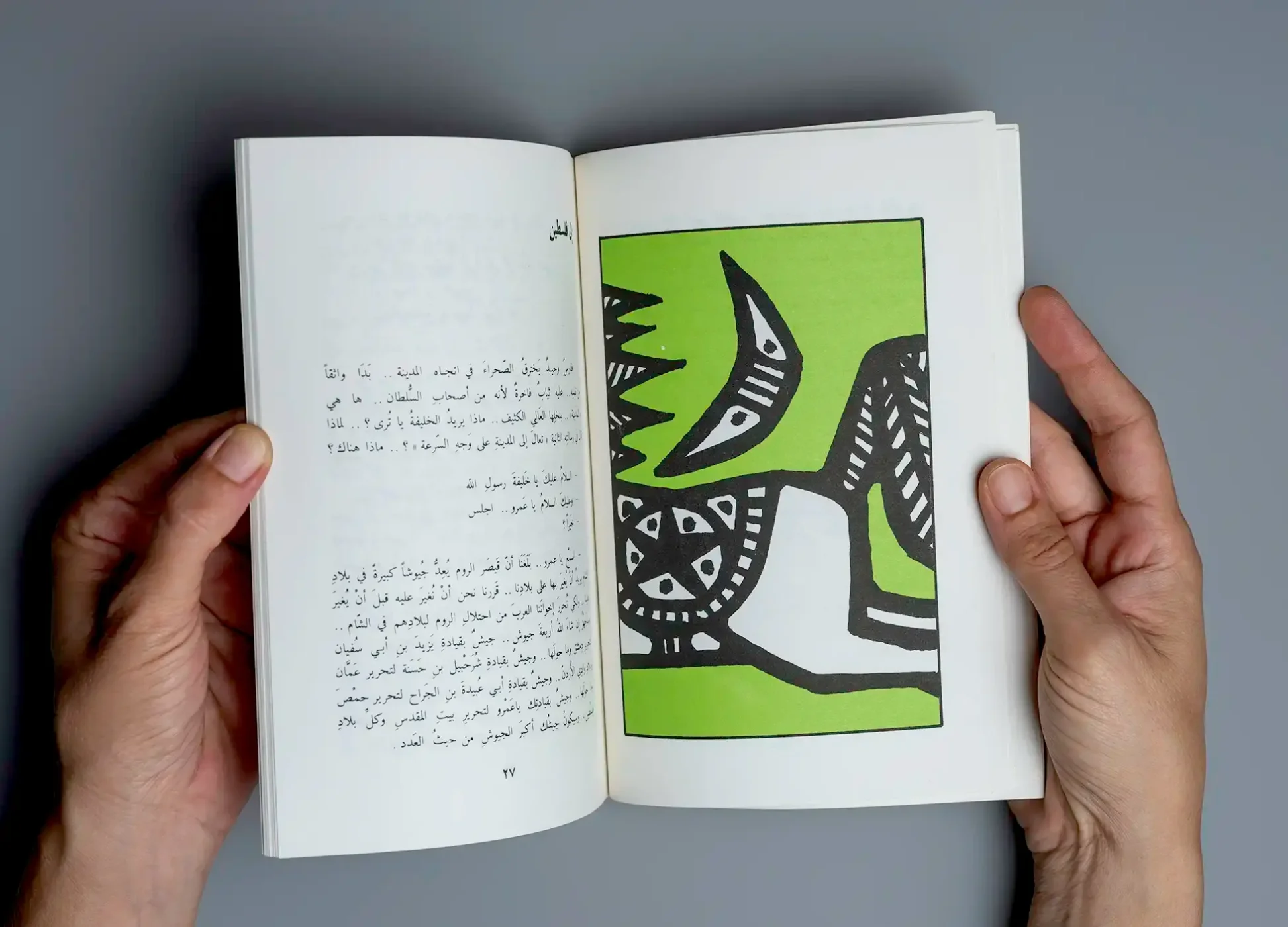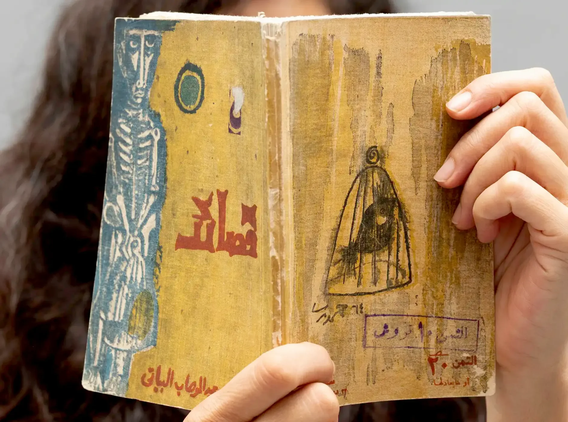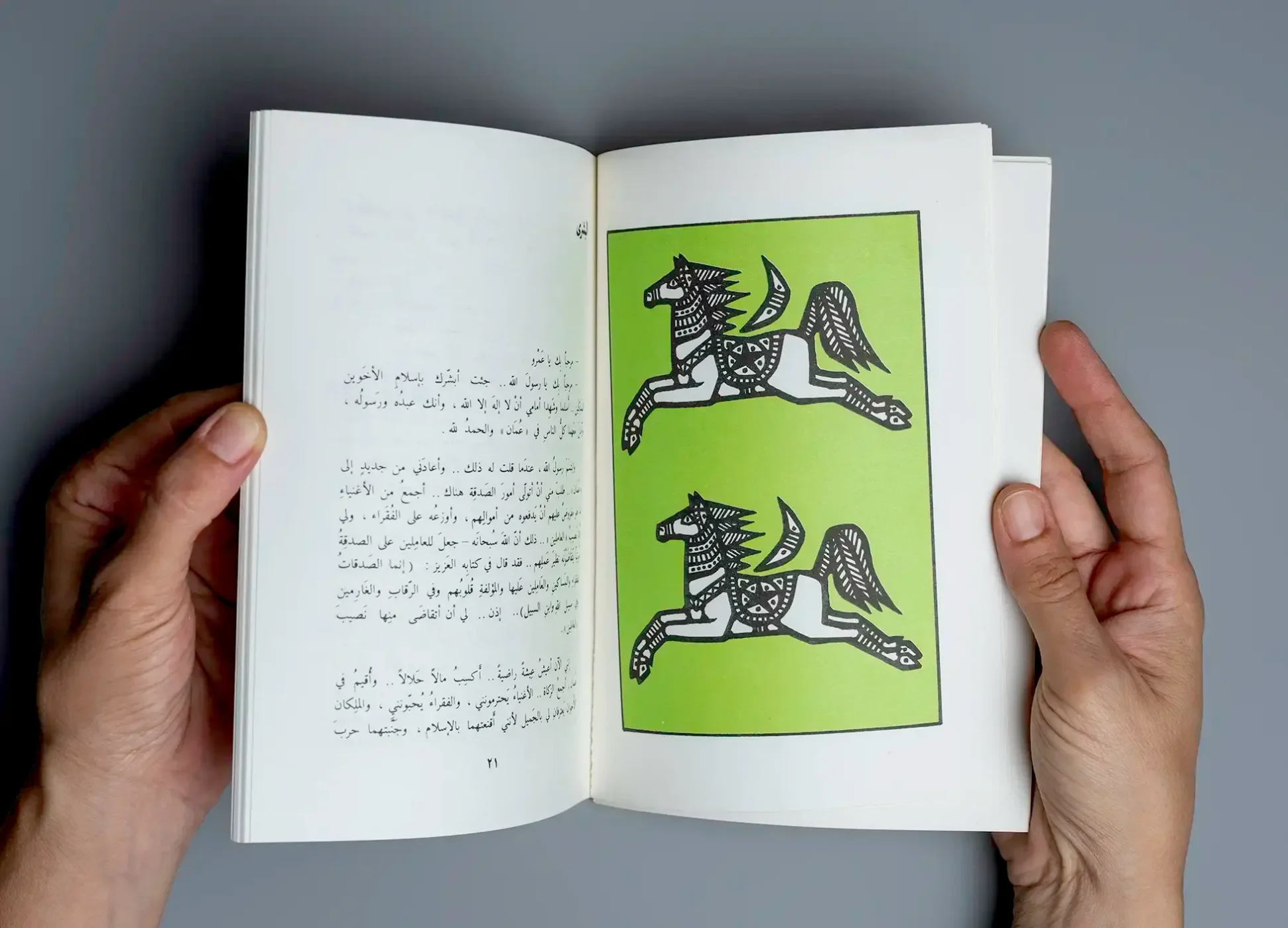The changing visual economy of Arabic books extended beyond the cover image. Books are three-dimensional objects, closely linked to the human body in terms of size, weight, paper, and binding. These physical qualities cater to various reading contexts, and in doing so, helped create new book markets. From low-cost paperback editions and children’s picture books that fit in the palm of a hand, to large, lavishly printed poetry anthologies and limited-edition artists’ books, each design choice shaped a distinct reader experience.